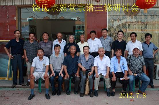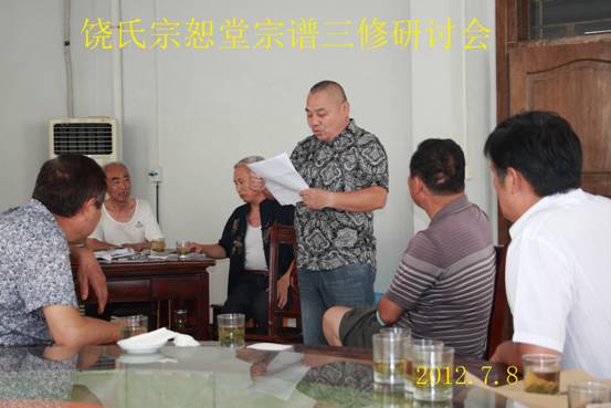 炎炎夏日,骄阳似火,2012年7月8日,饶氏忠恕堂第三次家谱修订研讨会,在河南省光山县白雀园镇隆重召开,来自商城、潢川、光山二十多位代表参加了本次会议。首先由族盟股份饶氏文化研究中心理事、《中华饶氏通谱》编委委员饶德安同志就本次会议的原由、内容、意义和要求作出说明,本次会议是在族盟股份饶氏文化研究中心及河南分会饶祖意会长策划指导下召开的,属于中原饶氏文化资源调查工程的一部分,会议就家谱三修工作的开展、方式、内容等事宜开展讨论,大家是踊跃发言,提出了很多很好的建议,形成了多项共识。为以后工作正式开展奠定了基础和方向,同时大家还就饶氏宗亲在经济、文化等方面加强联系和开展合作提出了许多愿景和希望。